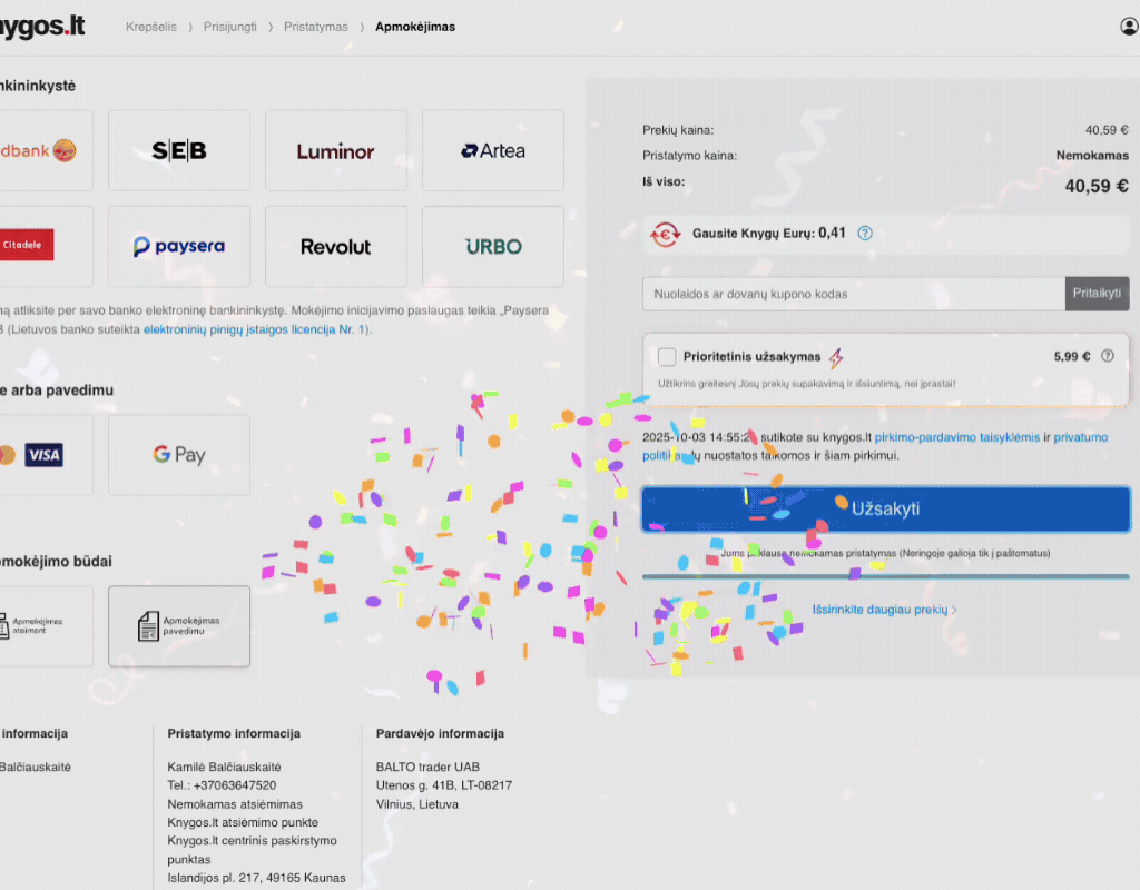 Pasiūlymas galioja tik internete. Dovanų kiekis ribotas. Pasiūlymas baigsis, kai baigsis dovanoms skirtas kiekis. Negalioja perkant skaitmeninius dovanų kuponus, el. knygas ir skaitytas knygas.
