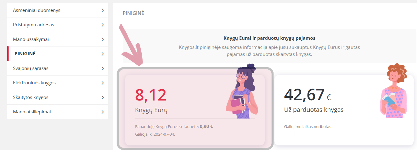 KNYGŲ EURŲ likutį visuomet matysite prisijungę prie savo vartotojo profilio, skiltyje PINIGINĖ: