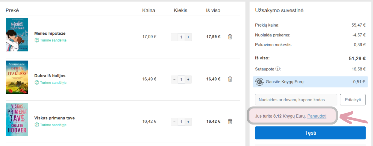 Prekių krepšelyje matysite, kiek turite sukauptų KNYGŲ EURŲ. Norėdami panaudoti KNYGŲ EURUS, pirmame arba penktame krepšelio žingsnyje paspauskite mygtuką „Panaudoti“ ir atlikite pirkimą. Čia taip pat sužinosite, kiek gausite KNYGŲ EURŲ užsisakę prekes. KNYGŲ EURAI į Jūsų sąskaitą bus pervesti, kai atsiimsite apmokėtą užsakymą.